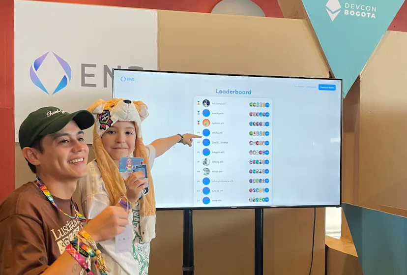 The young gentleman proudly standing in front of the leaderboard with his dad is ethilio.eth. He is 7 years old, came in without an ENS name, and ended up meeting 340 attendees.