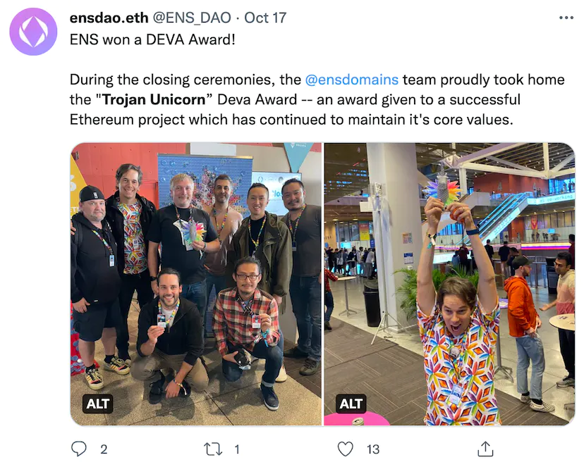 I have been to various Ethereum events since 2016 and have seen many crypto related event swags but it was always too difficult to onboard even people who are into crypto, let alone newbies on the spot. In the year 2022, we now have many mobile wallets to choose from and installing and setting up accounts seem doable. Converting fiat to crypto is still not the easiest hence we onboarded some people (26 people in precise) by gifting ENS names through ENS fairly bots created by our ENS DAO member gregskril.eth. At the end of Devcon, we received the "Trojan Unicorn Award" for bringing web3 and blockchain to the mainstream, without losing our core values. Unlike many speculative NFTs, ENS annual registration ($5/year) is cheap enough to gift and we think it's the best first NFT for anyone new to crypto and Web3.