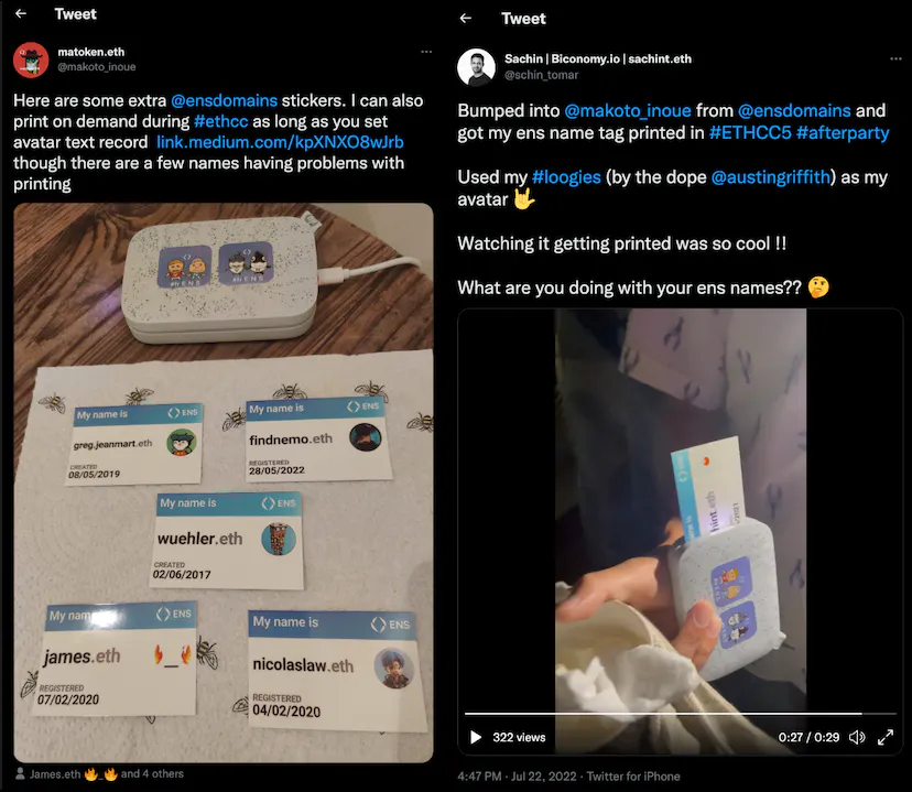 Since EthBarcelona we bought a few small inkless printers and printed name tags with your .eth names and avatars to those who set the avatar text record. Even though many participants now have their own ENS name, it's still a minority of people who actually know how to set up their PFP as an ENS avatar. However, many people came back to me the following day so I print name tags for them. Two people even set up an ENS avatar record in the middle of the side events (it was at a Wallet Connect side event so the ratio of participants who can interact with Ethereum from mobile was high).