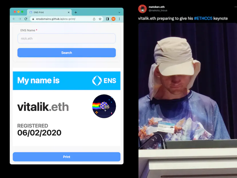 If you missed us at Ethcc but want to have ENS name tag, you can go to ensdomains.github.io/ens-print and generate one on your own. The example below is how vitalik.eth looks and I managed to stick it into Vitalik himself right before his keynote.
