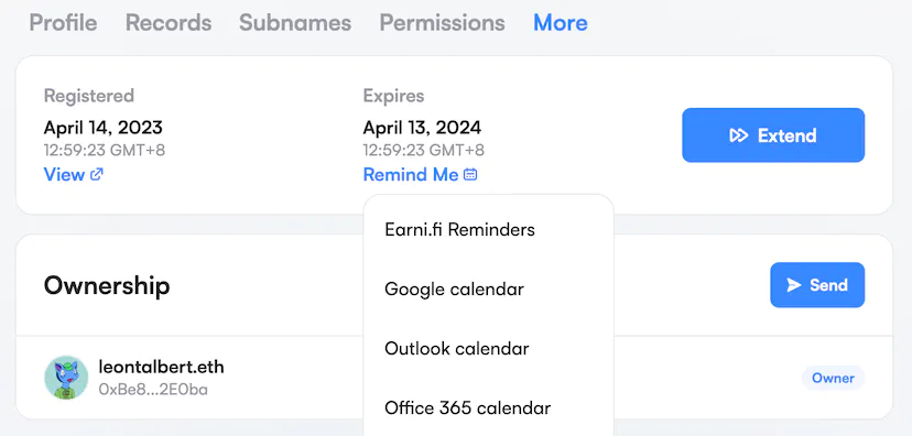 We've partnered with earni.fi to bring you expiry reminders via email. These reminders will work for any name you are interested in, and you will get a reminder one month, one week, and one day before expiry. Simply navigate to the 'more' tab on any name and click 'Remind me' as shown below. You'll be asked to provide the email address you would like the reminders to be sent to, and once you click the confirmation email in your inbox you'll be all set.