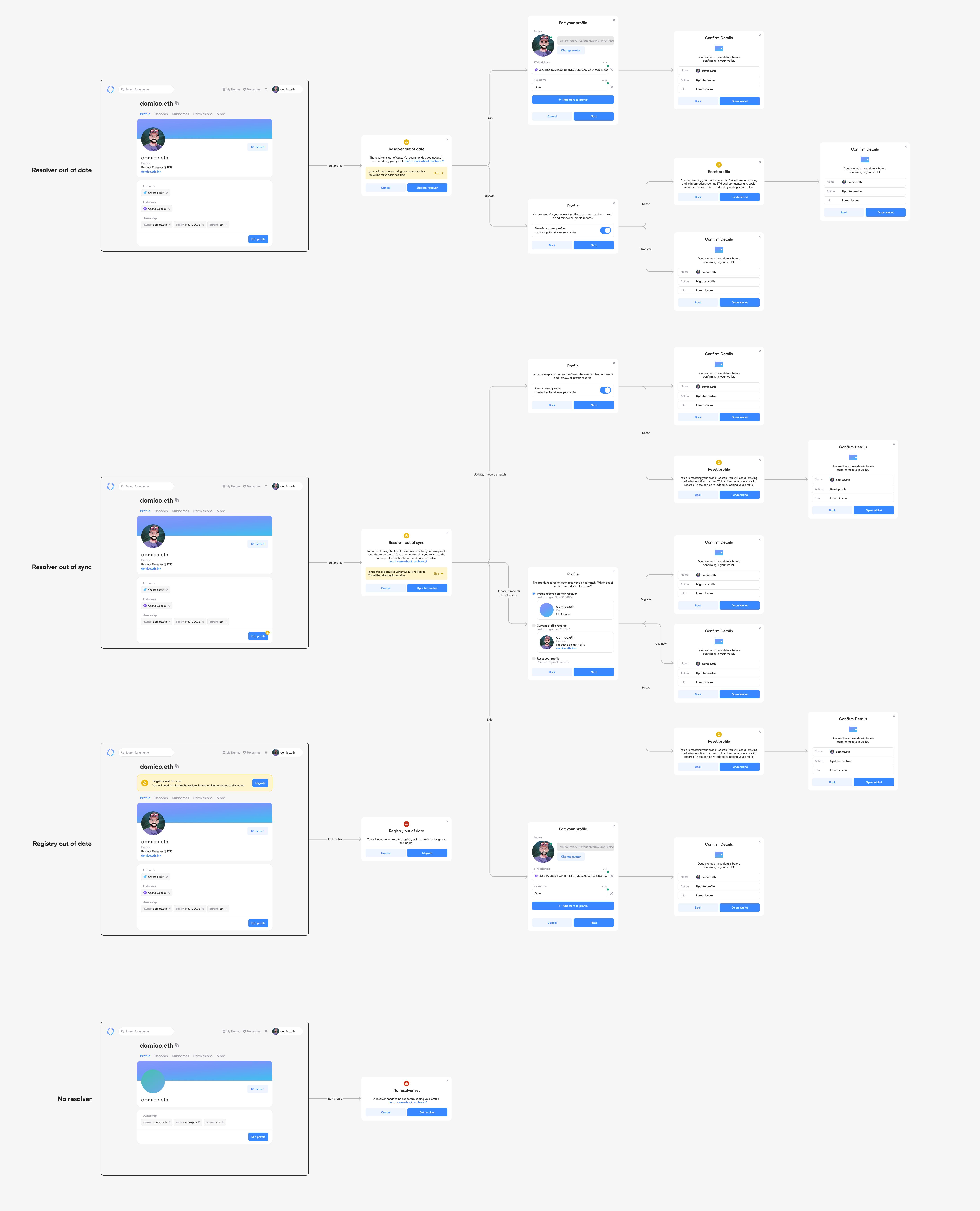 Migrate/Resolver out of sync: We've completely rethought this flow. Previously, it forced you to either migrate your records to the new resolver or use the records on the new resolver after editing the profile. Now it asks you if you want to change your resolver (which you can ignore), then checks if the records between resolvers are out of sync. If they're in sync, you'll have the option to reset or keep your profile. If they're out of sync, you'll get options to reset, migrate, or use the profile that exists on the new resolver. We've also added a warning for people resetting their profile.