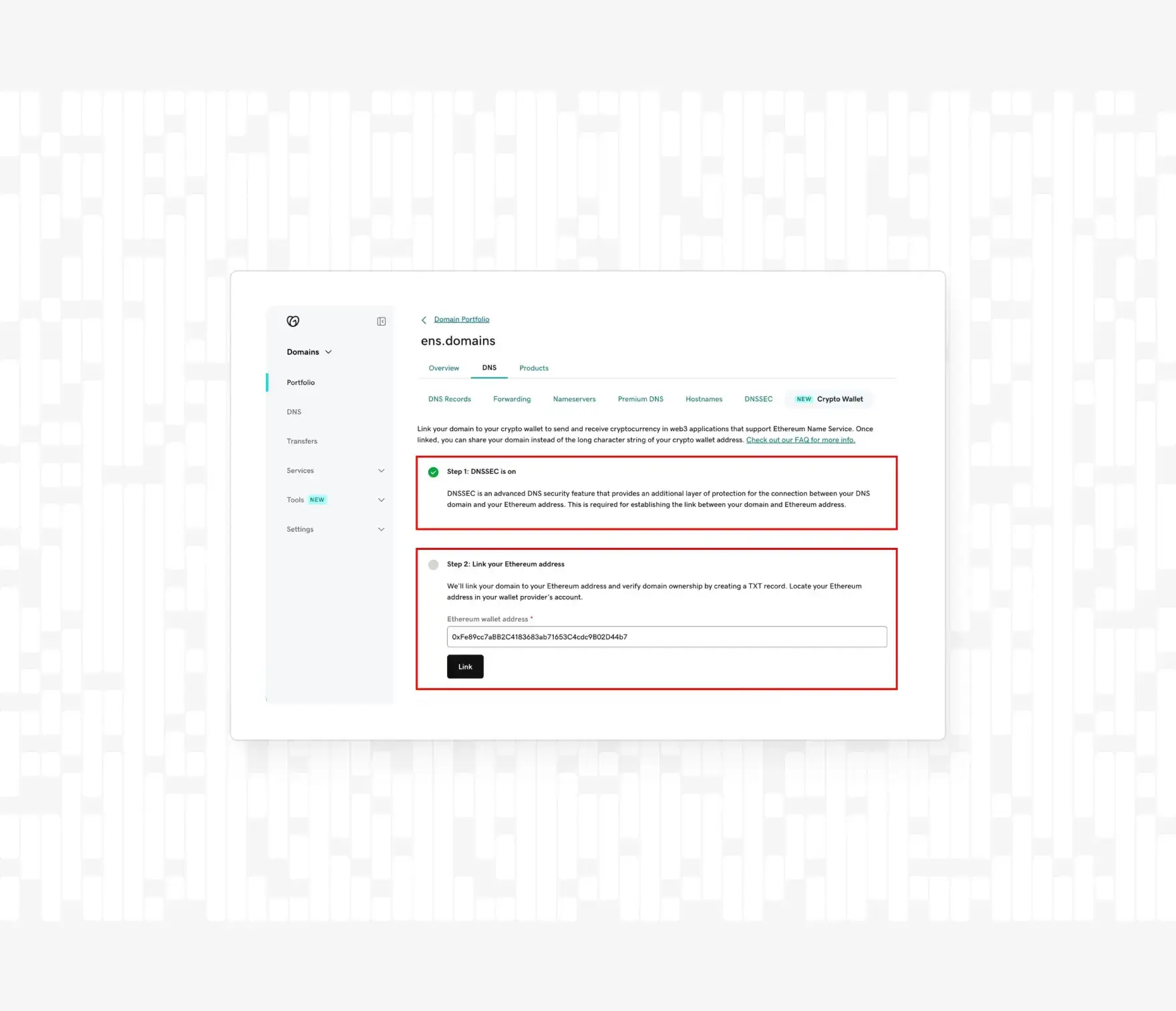 With ENS’s Gasless DNSSEC upgrade (ENSIP-17), GoDaddy offers a one-click “Crypto Wallet” record that transforms a customer’s existing DNS domain into a fully functional ENS name.